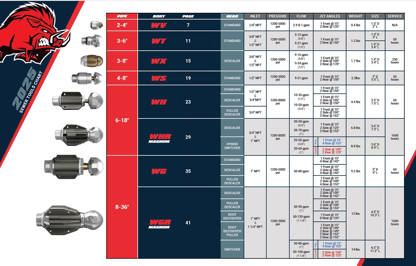 Warthog 擁有業界最完整的可控制旋轉噴頭(Controlled-Rotation Tools)產品系列,專門針對頑固堵塞與日常管線清洗需求所設計。